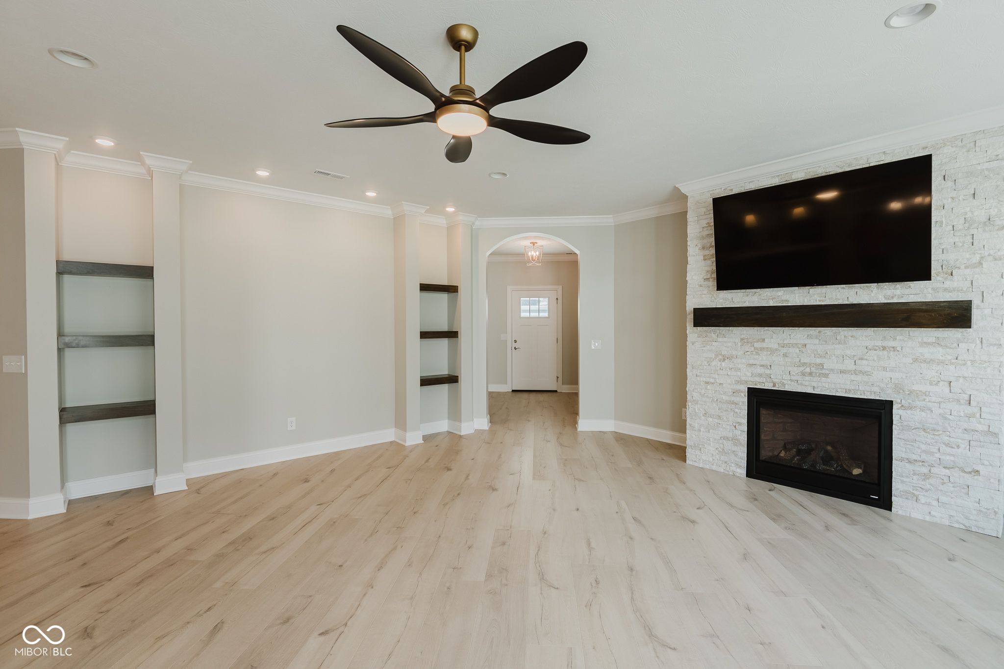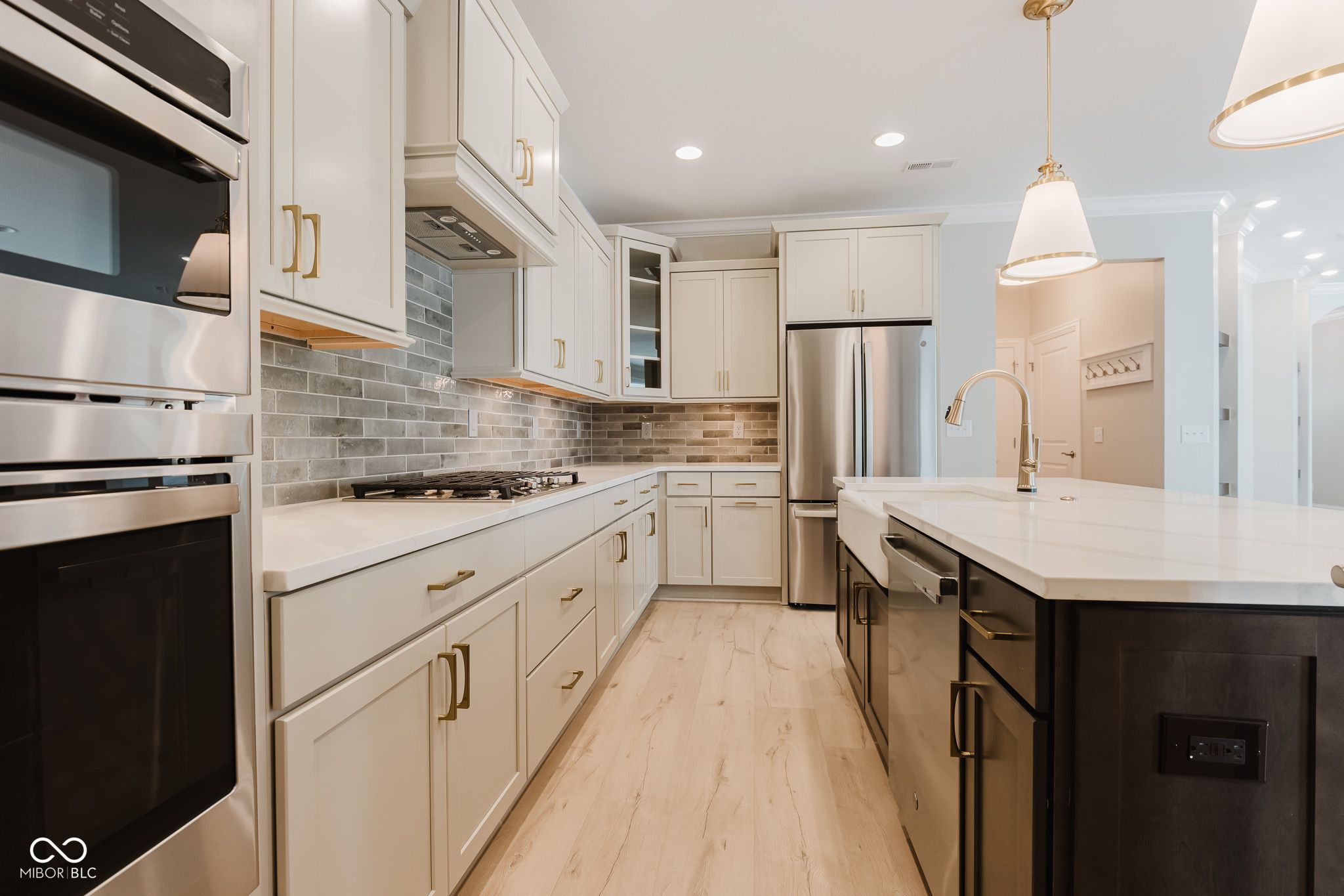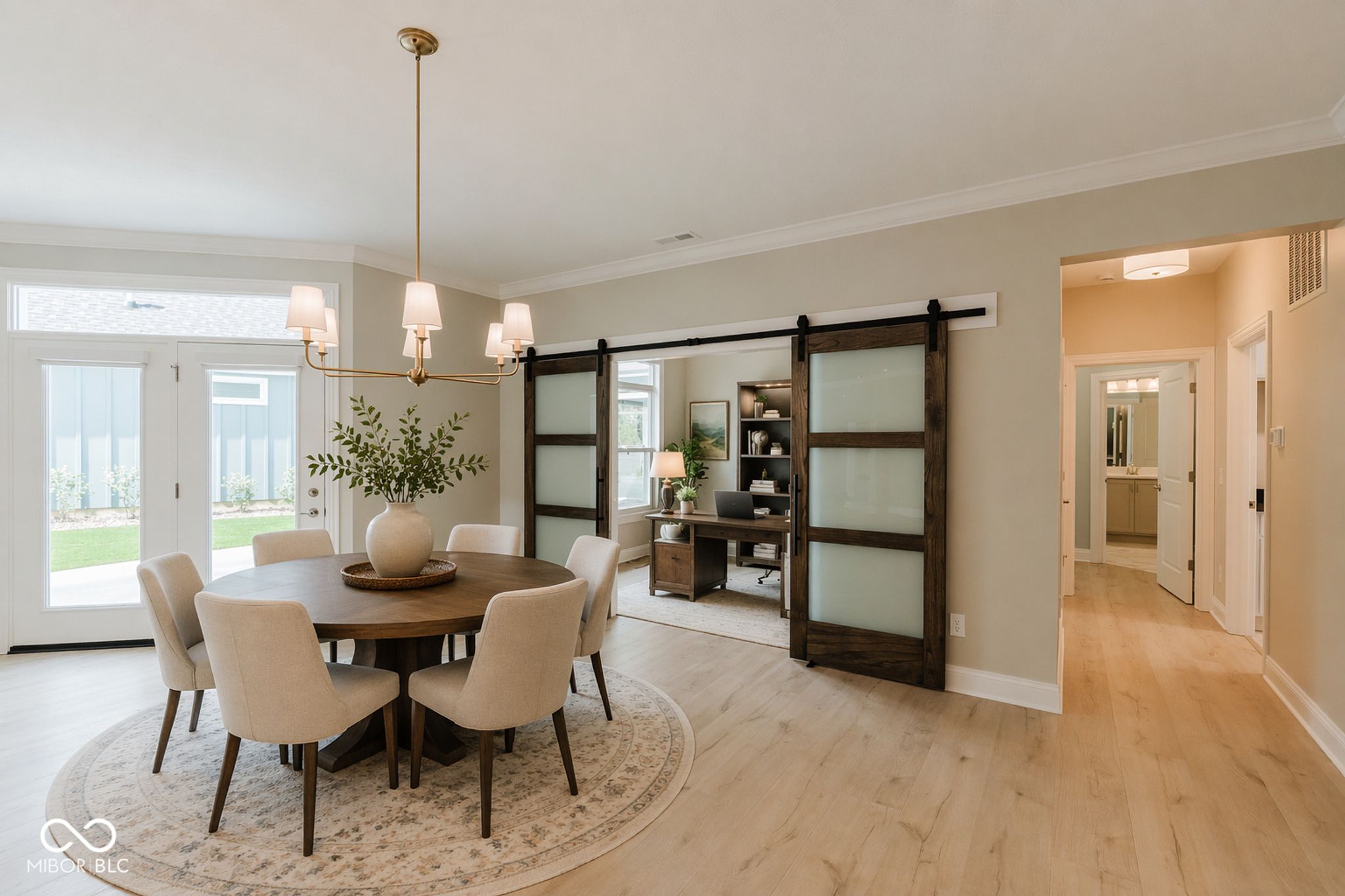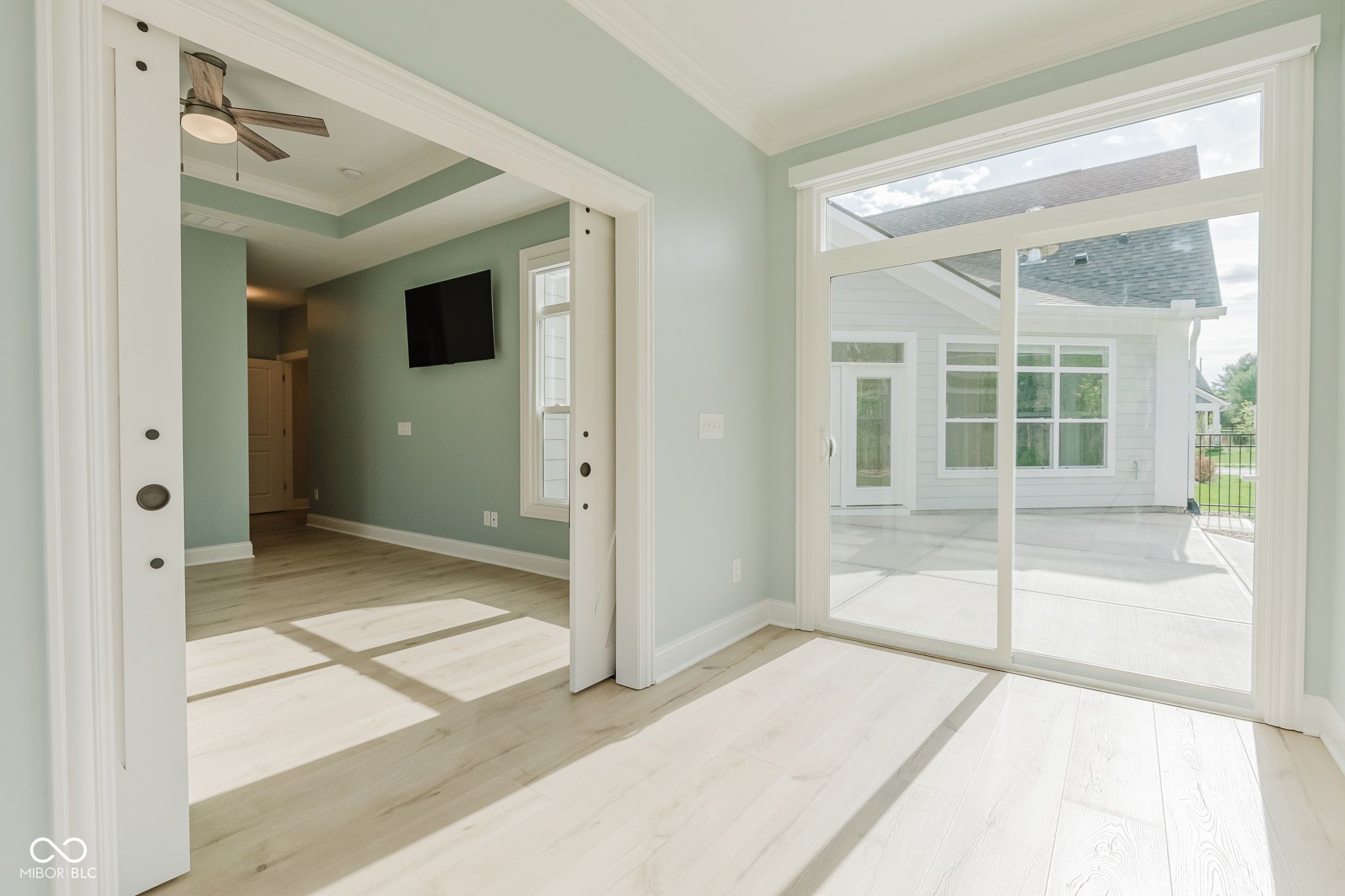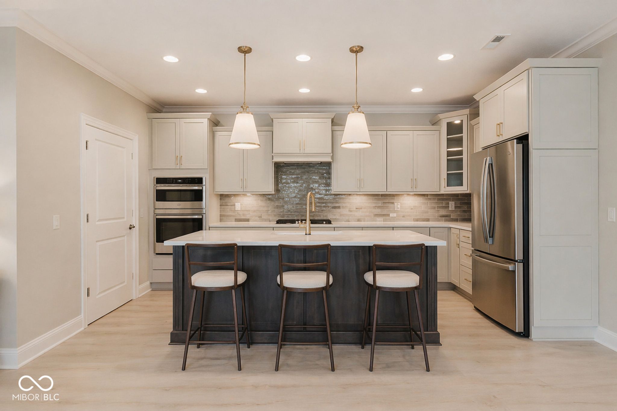Less than one year old and truly move-in ready, this beautifully upgraded Promenade floor plan by Epcon in The Courtyards of Fishers offers the ease of low-maintenance living in one of the community's most peaceful settings. Tucked along a wooded nature preserve in an intimate neighborhood of just 50 homes, this residence blends thoughtful design, accessibility, and quality finishes throughout. From the covered front porch, a zero-step entry welcomes you into a spacious main living area with a natural flow and plenty of flexibility in how the space can be enjoyed. The kitchen is beautifully appointed with quartz countertops, a large center island with seating, gas range, wall oven, soft-close cabinetry, tile backsplash, pantry storage, and included appliances. The main-level primary suite offers a private sitting room overlooking the courtyard, a generous walk-in closet with Closet Concepts organization, dual vanities, a water closet, and a beautifully finished tile shower. A main-floor den with sliding doors provides an ideal space for a home office, reading room, or music room, while the front bedroom and adjacent full bath create a comfortable setup for overnight guests. Upstairs, a spacious second living area, third bedroom, and third full bath provide excellent separation for family visitors, grandchildren, hobbies, or movie nights. Additional upgrades include motorized window shades, updated lighting, new interior paint, epoxy flooring in the garage, included televisions in the great room and primary suite, and 36-inch doorways and hallways for added function and accessibility. Outside, the private patio, fully fenced low-maintenance turf lawn, and wooded backdrop create a peaceful place to relax, while lawn care and snow removal are included through the monthly HOA!