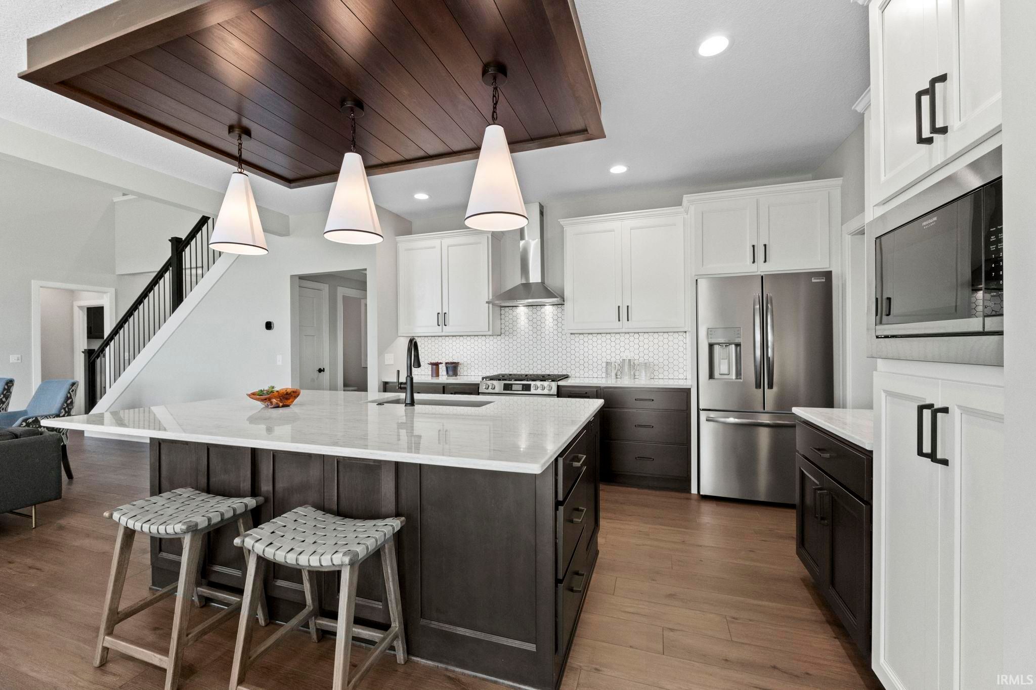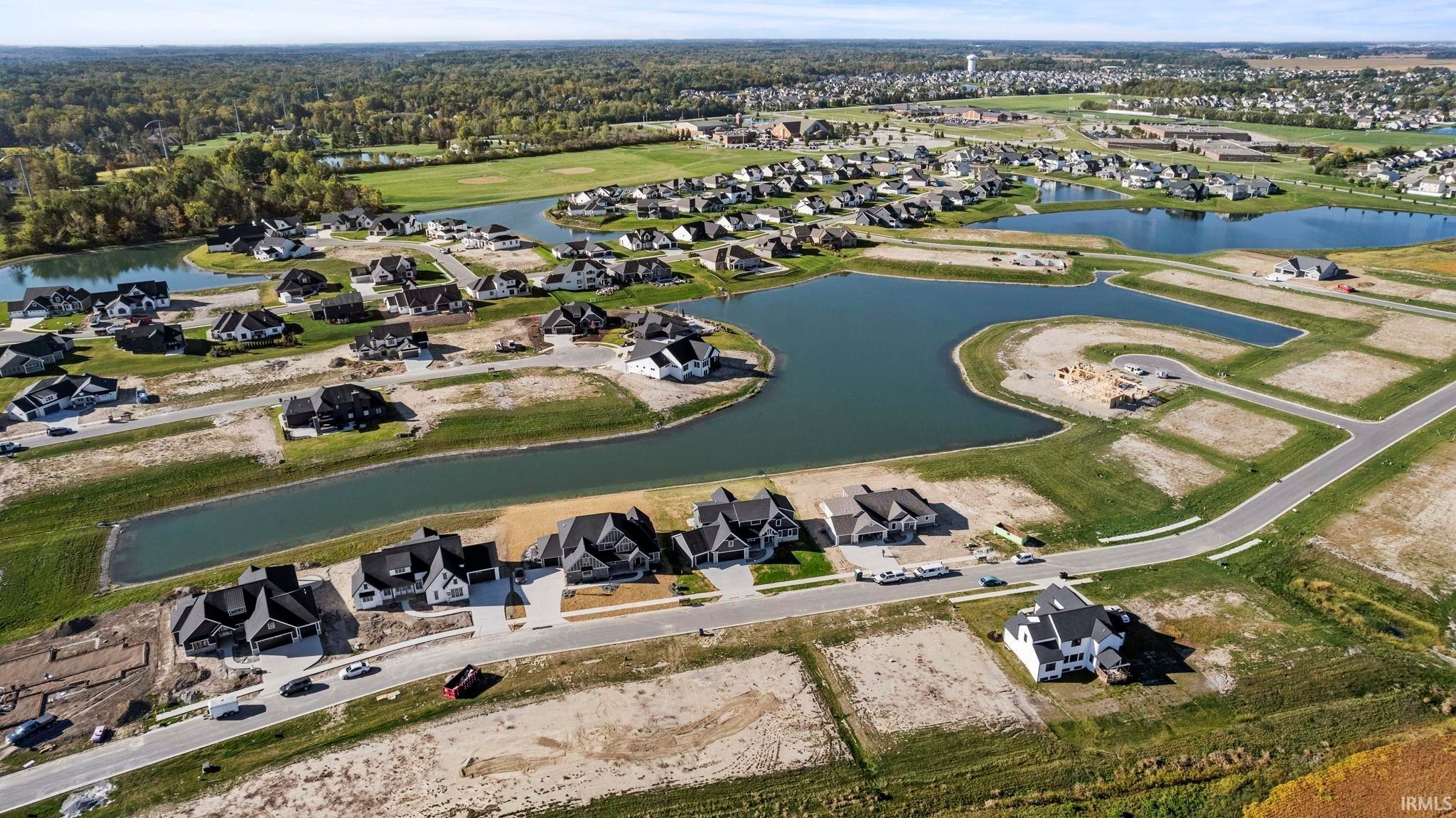 Waterfront Living by Bob Buescher Homes | Brand New | Warranties Begin at Closing. Experience the opportunity to own a completed waterfront home in Mercato by one of Fort Wayne’s most recognized custom builders. Built in 2024 and treated as new construction, this home includes builder warranties beginning at closing, offering confidence and peace of mind typically reserved for just-completed builds. Positioned on a scenic pond lot, this 3,426 sq ft two-story design offers four bedrooms, 3.5 baths, and an oversized 1,061 sq ft three-car garage. Inside, a dramatic two-story great room captures attention with expansive windows framing water views and a custom fireplace adding warmth and architectural presence. Natural light fills the open-concept layout, flowing seamlessly between the living, dining, and kitchen spaces; ideal for everyday living and entertaining. The kitchen showcases custom Zehr cabinetry, a generous 5x8 quartz island, gas range with stainless hood, tile backsplash, and a 10-foot-deep walk-in pantry. Just off the dining area, a versatile sunroom provides flexibility as an office, sitting room, or quiet retreat with pond views. The main-level primary suite offers privacy and convenience with a spacious bedroom, spa-inspired bath featuring a tile walk-in shower, double vanity, private water room, and expansive walk-in closet. The adjacent laundry room enhances functionality. Upstairs, three additional bedrooms are arranged alongside a Jack-and-Jill bath, an additional full bath, and a large bonus room positioned away from the bedrooms; ideal for media, work, or recreation. Direct attic access adds storage convenience. Outdoor living extends to the covered rear porch overlooking the pond, perfect for morning coffee or evening sunsets. With nearly 3,500 finished square feet and immediate possession available, this home delivers the quality and design of custom construction without the extended build timeline. Mercato offers convenient access to I-69, Lutheran Hospital, shopping, and dining. This is more than new construction, it is completed waterfront living by Bob Buescher Homes.