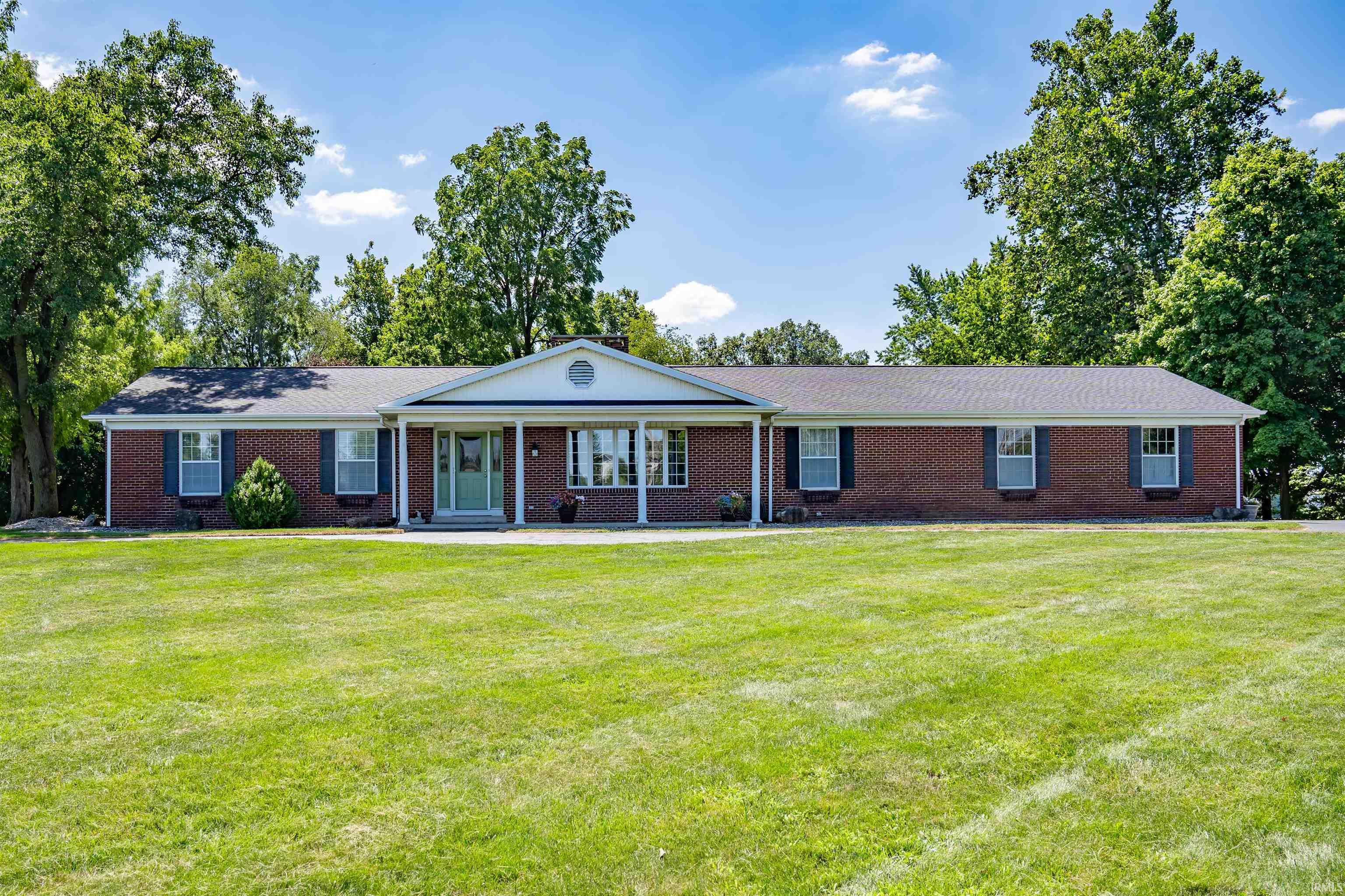 Incredible opportunity to own this sprawling, all brick ranch at entry of Blue River Estates! This home boasts a massive finished walk-out basement with full wet bar/kitchenette, gorgeous sunroom & elevated back deck on 2.84 stunning acres! Located on an expansive lot and mere minutes from city limits, this 3 bedroom (possibly 4), 4 bath (2 full & 2 half) ranch is completely move-in ready with lots to love & much to offer at over 5,000 finished sq ft. Built in 1985, this completely brick home has been well maintained from outside in with new roof in 2016 & new boiler system, plus all kitchen & basement appliances remain. Sure to charm from moment you arrive, long recently resealed driveway runs length of house ending in loop for overflow parking in addition to attached 3 car garage. Attractive exterior is stately and front door opens to bright & welcoming atmosphere complemented by quality construction & a neutral color palette. Family room offers an open concept living area featuring a white brick fireplace with stone hearth, flanked by built-in shelves & french doors to four seasons room. Wrap around breakfast bar great for quick bites separates living from eat-in kitchen with abundant cabinetry, tile backsplash, SS appliances & casual dining nook. Formal dining off kitchen is perfect for entertaining with modern chandelier & open to front living room/office with wall of bay windows. Large primary bedroom includes en suite bath with tub/shower; remaining 2 bedrooms are both comfortably sized with ample storage throughout. Main shared bath is updated & stylish with dual sink vanity & tub/shower; one half bath is on main level next to laundry & garage access with one more half bath in basement. Huge lower level (2400 finished sq ft) is heated by gas log fireplace with tons of space for 2nd living, home theater/gym, games/rec & several smaller rooms for additional storage or workshop/crafts & sliding glass doors to back yard. Fantastic sunroom off family room provides amazing panoramic scenic views with 2 skylights, wood detail ceiling & 2 doors to oversized back deck. Sure to be a popular gathering spot, raised wood deck is almost completely new and ideal for dining al fresco or simply relaxing & enjoying spectacular nature views. Big yard has plenty of room for all kinds of outdoor fun & activities with gazebo too! This won’t last long—reach out today!