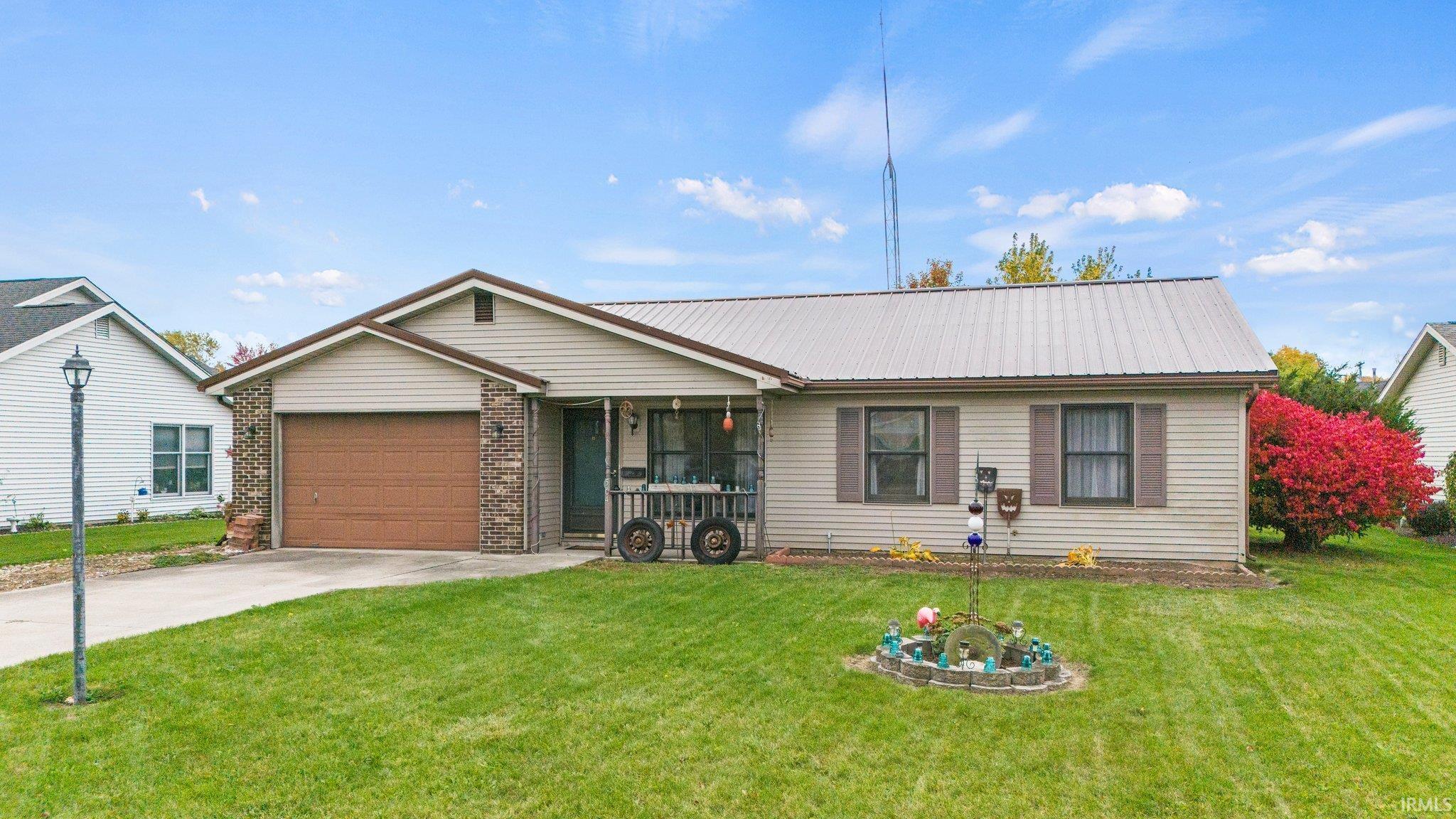 Nestled in the Villa North subdivision of Wells County, this charming property features a covered front porch and 1.5 car garage complete with workshop and storage space. Inside, you'll find a spacious living room connected to an open eat-in kitchen with back deck access and a convenient laundry area. Two sizable bedrooms, one with a walk-in closet, and a full bath provide comfortable living spaces. The 3rd bedroom was converted to enlarge the living room & could easily be converted back. Enjoy the oversized backyard with an open deck and utility shed for extra storage. Plus, it's conveniently located near the Green Valley Golf Club, Ouabache State Park, and a variety of dining options. Don't miss out on the chance to make this house your home!