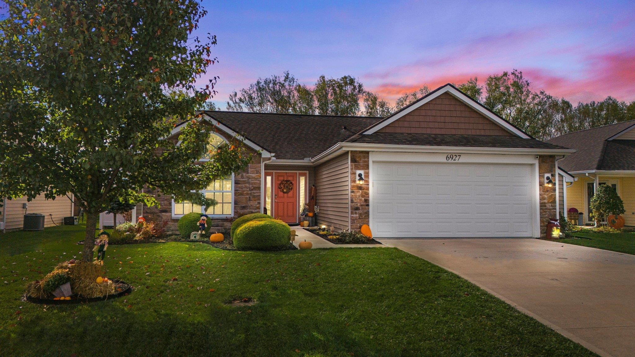 In the sought-after Stratford Forest subdivision in Fort Wayne, this property offers a peaceful setting and convenient location minutes away from Jefferson Pointe and I-69. Inside, the great room has a double trey ceiling, and the kitchen nook area has a cathedral ceiling with a half circle top window. The passthrough between the kitchen and great room offers seamless flow allowing connected entertaining and everyday living. The house features quality Shaw laminate flooring and a gas log stone fireplace. The bright, neutral paint throughout and white painted trim creates an inviting atmosphere. The kitchen includes all appliances, features a touchless faucet and custom Shelf Genie pull-out shelving in pantry and selected cabinets. The master bedroom includes a private bathroom and walk-in closet with closet tamers. The backyard boasts garden boxes and a vinyl privacy fence, along with a relaxing 3 seasons room with vaulted and beamed ceilings. The property also offers a finished, oversized 2-car garage. Conveniently located near Buckner Park via a trail, and just down the road from Sweetwater, plus the video doorbell stays with the home and Nest smart thermostat. You won't want to miss this opportunity.
