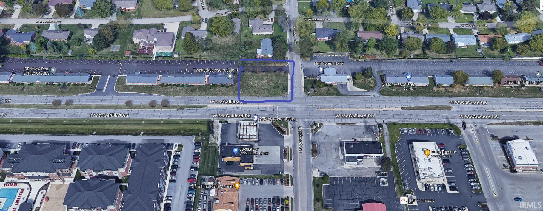 Prime McGalliard and Oakwood corner suited for office or retail use. Level site with some asphalt parking/drive. Easy ingress/egress to Oakwood at the light or on McGalliard going west. City utilities available at site. Shared parking and access through property owners association. High traffic count provides outstanding visibility. Priced to sell!